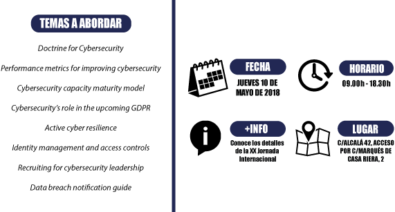La XX Jornada Internacional de Seguridad de la Información tendrá lugar el próximo 10 de mayo en el Círculo de Bellas Artes de Madrid (C/ Alcalá 42, Acceso por C/ Marqués de Casa Riera, 2). Para inscribirte, haz clic aquí.